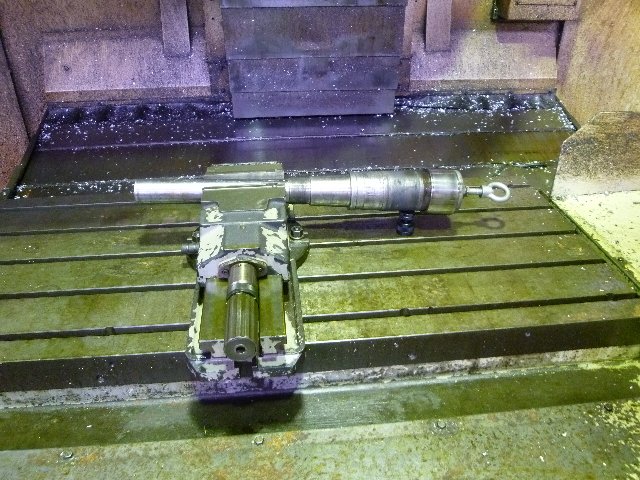 シャフトのほうのキー溝は、シャフトがテーパーなので、シャフトを傾けて切ります。