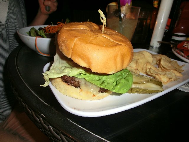 サラダ、ナチョス、大きいハンバーガー。